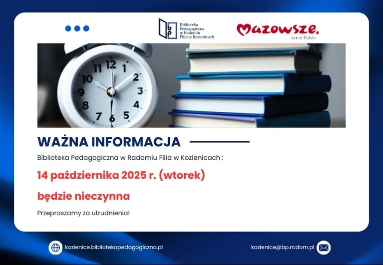Informujemy, że 14 października 2025 Biblioteka Pedagogiczna w Radomiu Filia w Kozienicach będzie nieczynna.