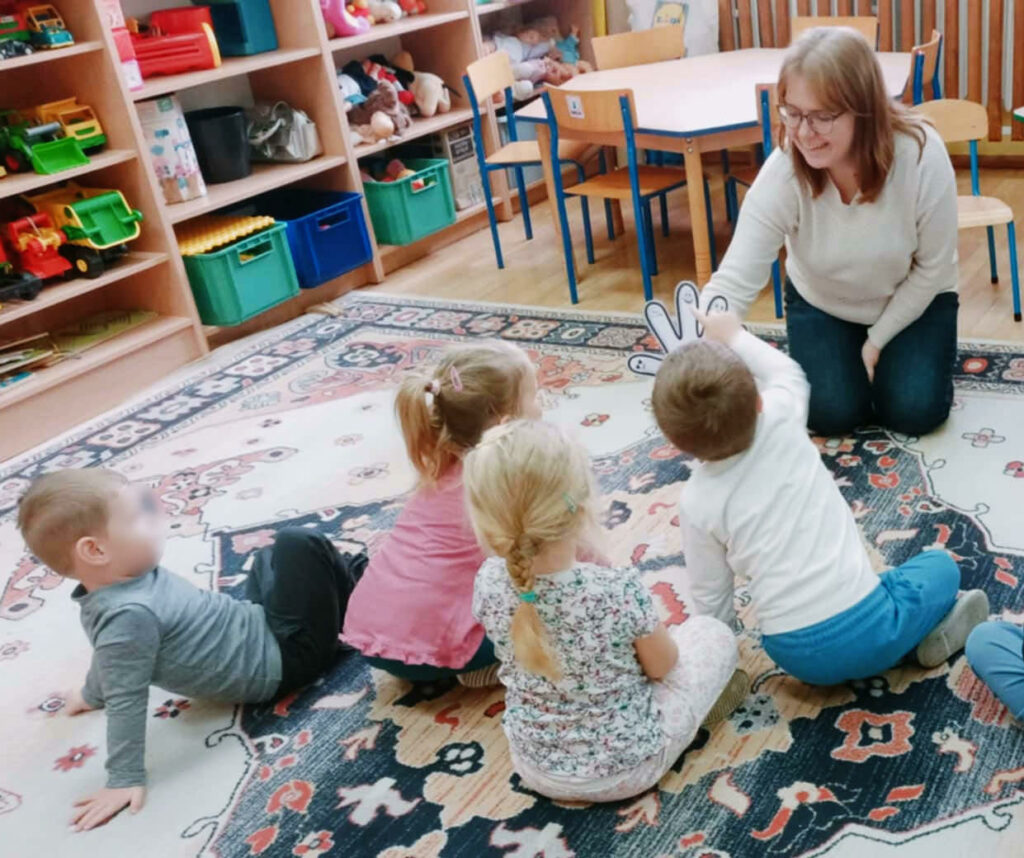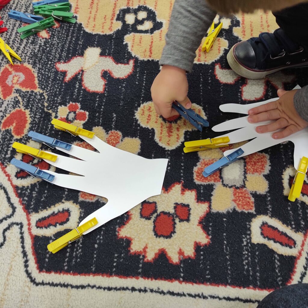 Maluchy z grupy 3–4 latków wysłuchały opowieści „O Panach Palcach”, która stała się pretekstem do poznawania nazw palców, liczenia oraz zabaw paluszkowych. Najwięcej radości sprawiło im dekorowanie papierowych dłoni kolorowymi spinaczami, co w naturalny sposób rozwijało ich spostrzegawczość i koordynację