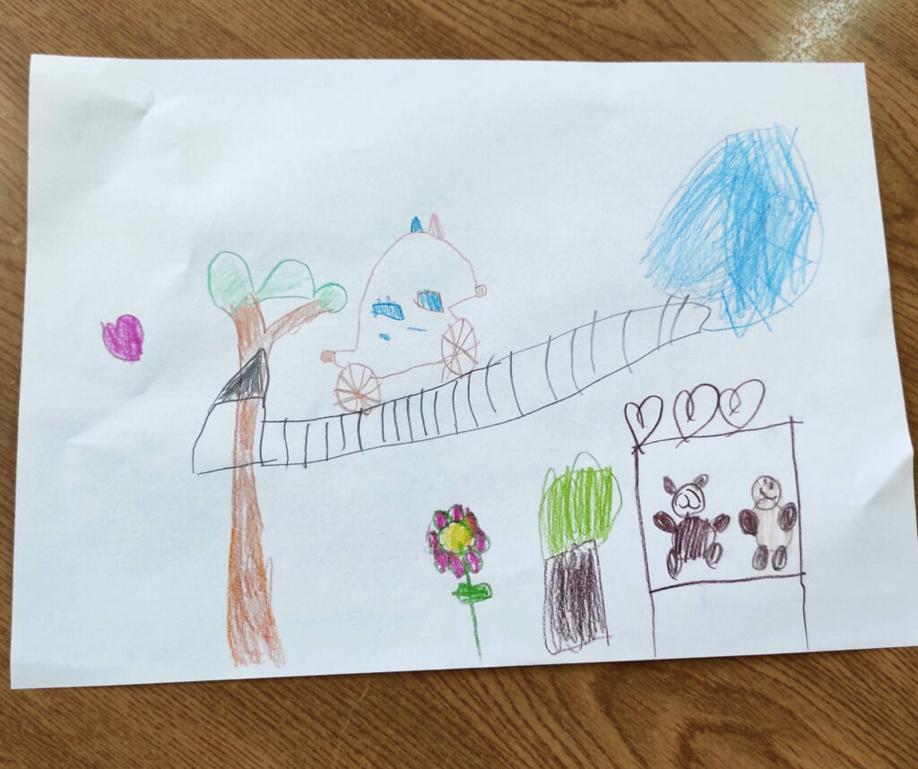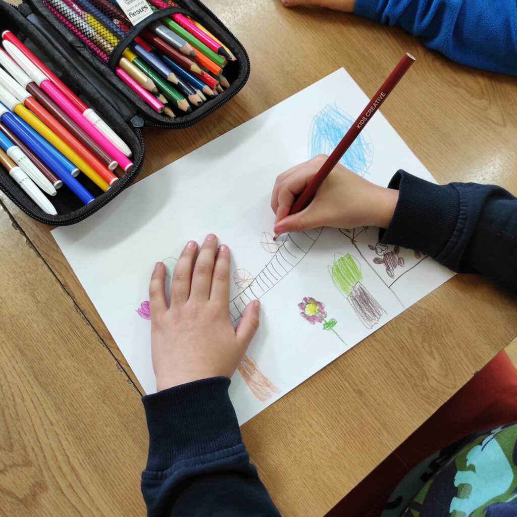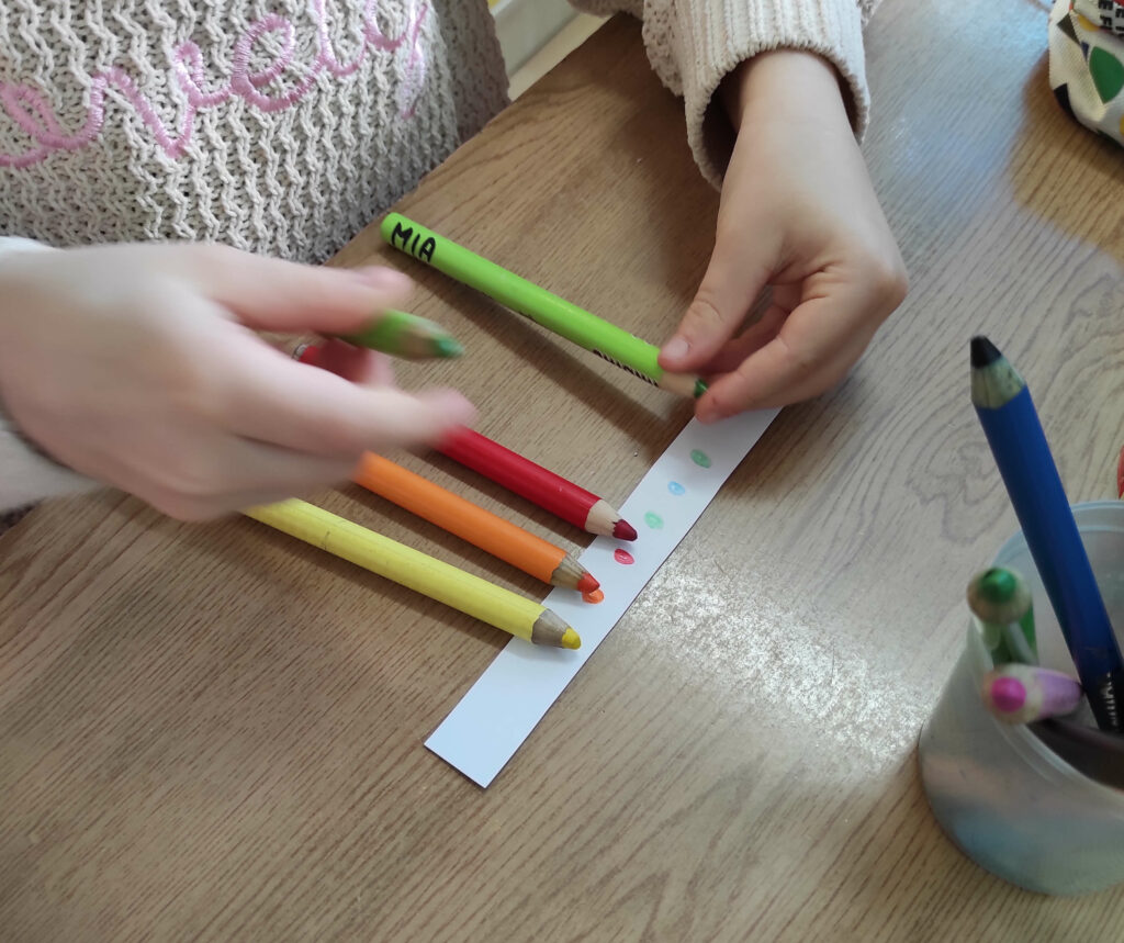 Starszaki z grupy 5–6 latków wzięły udział w zajęciach z okazji zbliżającego się Dnia Kredki. Z zainteresowaniem wysłuchały historii „Kolorowe kredki i Kraina Wyobraźni”. Rozmawialiśmy o ulubionych kolorach i wspólnie tworzyliśmy rysunek, do którego każde dziecko dodawało własny element. Na zakończenie zdaliśmy się na… los. Rzucaliśmy specjalnymi kostkami i rysowaliśmy to, co się na nich pokaże.