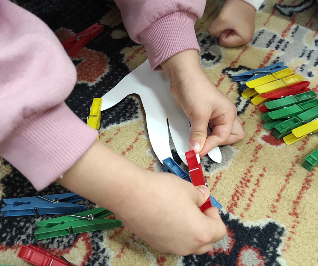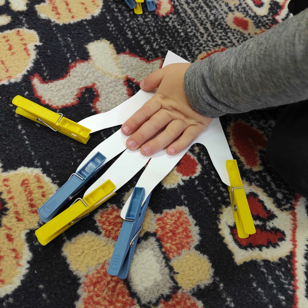 Maluchy z grupy 3–4 latków wysłuchały opowieści „O Panach Palcach”, która stała się inspiracją do poznawania nazw palców, liczenia oraz zabaw paluszkowych. Najwięcej radości sprawiło im przyczepianie według wzoru kolorowych spinaczy do papierowych dłoni, co w naturalny sposób rozwijało ich spostrzegawczość i koordynację