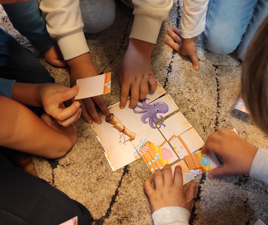 Uczestnicy wysłuchali historii i obejrzeli teatrzyk o zaginionej perle, a następnie – z mapą w ręku i w towarzystwie syren – wyruszyli na poszukiwania skarbu. Na ich drodze pojawiły się liczne zagadki i zadania, prowadzące przez podwodne krainy aż do kryjówki strzeżonej przez… fioletową ośmiornicę!