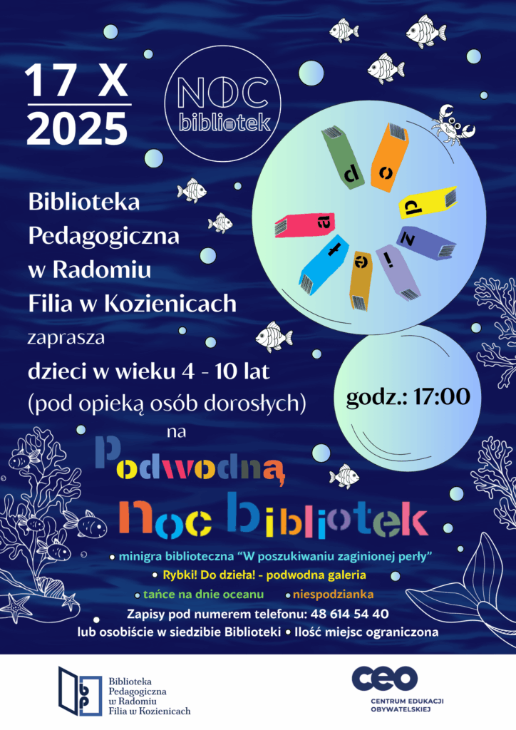 Nasza podmorska wyprawa rozpoczyna się o godzinie 17:00 w siedzibie naszej Biblioteki, ul. Nowy Świat 24, 26-900 Kozienice.