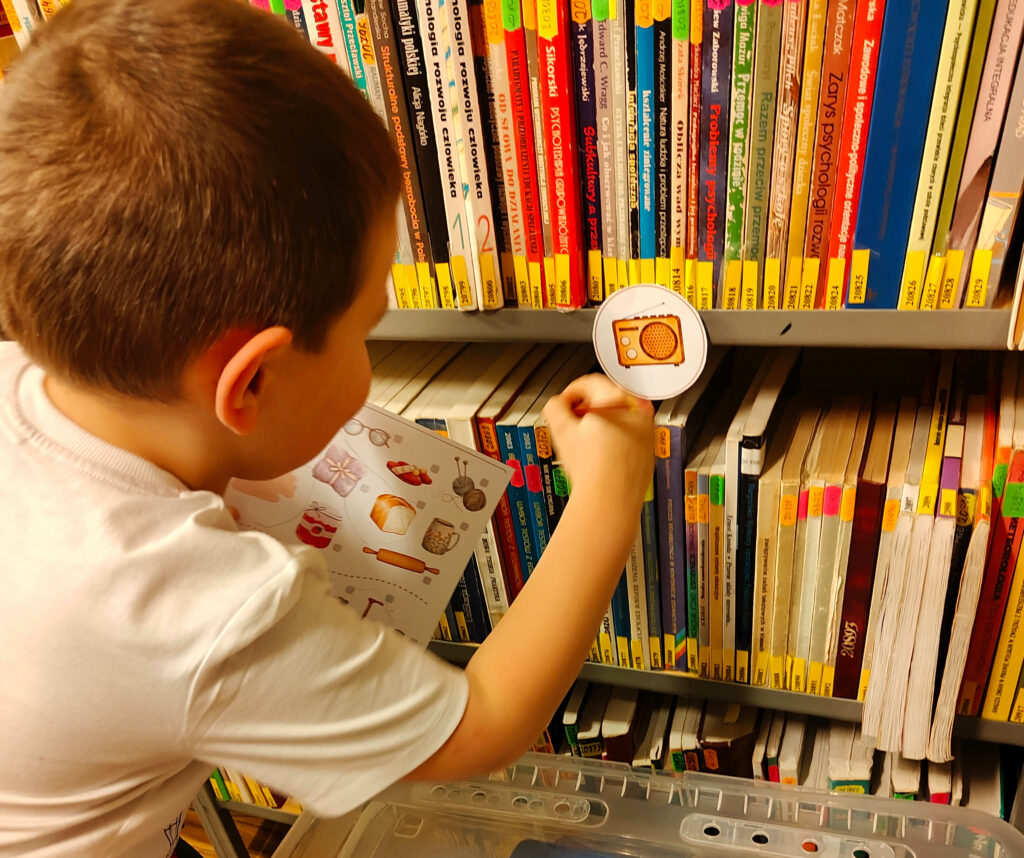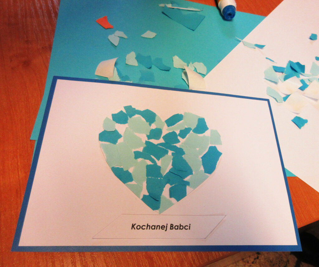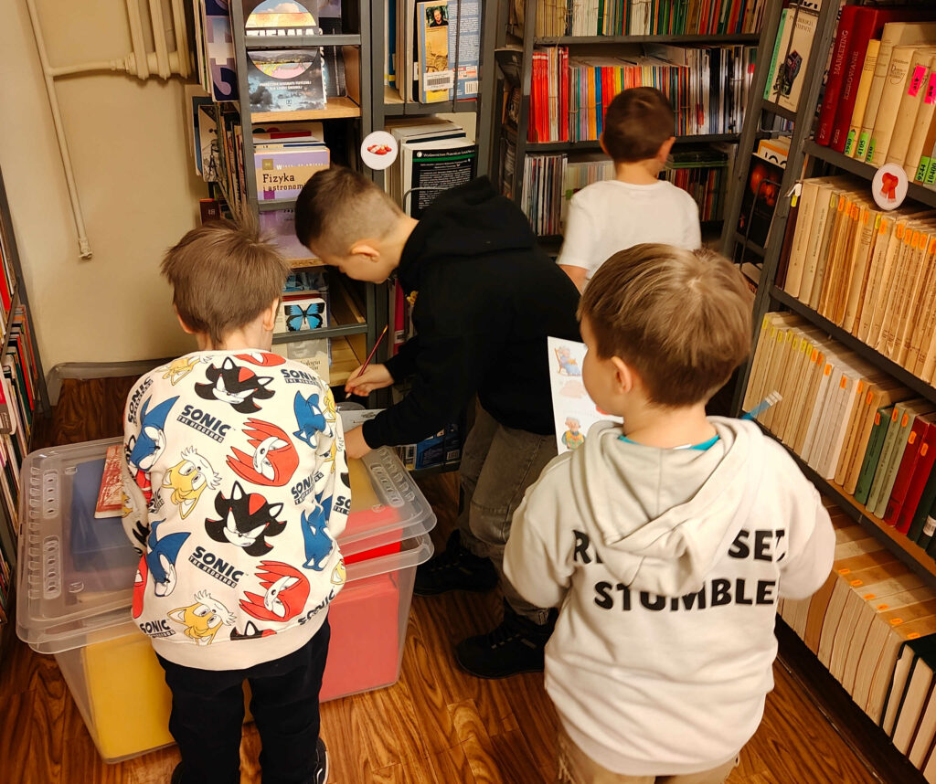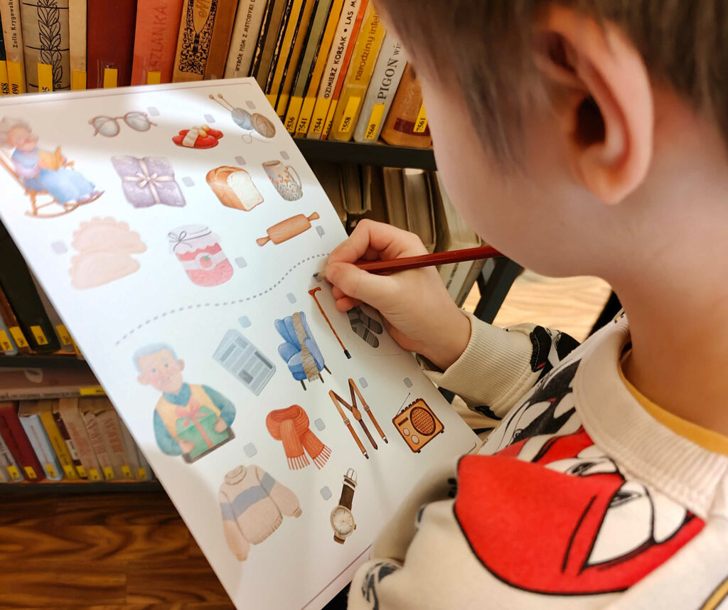 Podczas pierwszego spotkania stworzyli papierowe serce dla Babci i Dziadka, a po twórczej pracy z zapałem szukali zagubionych w Bibliotece przedmiotów związanych z babcią i dziadkiem.