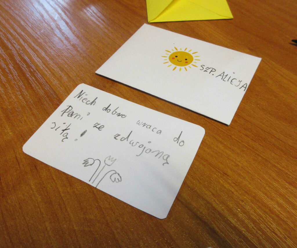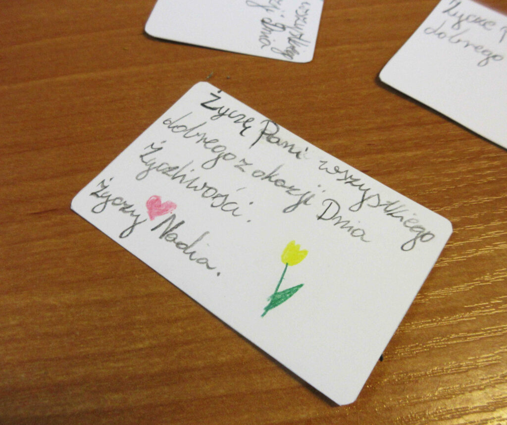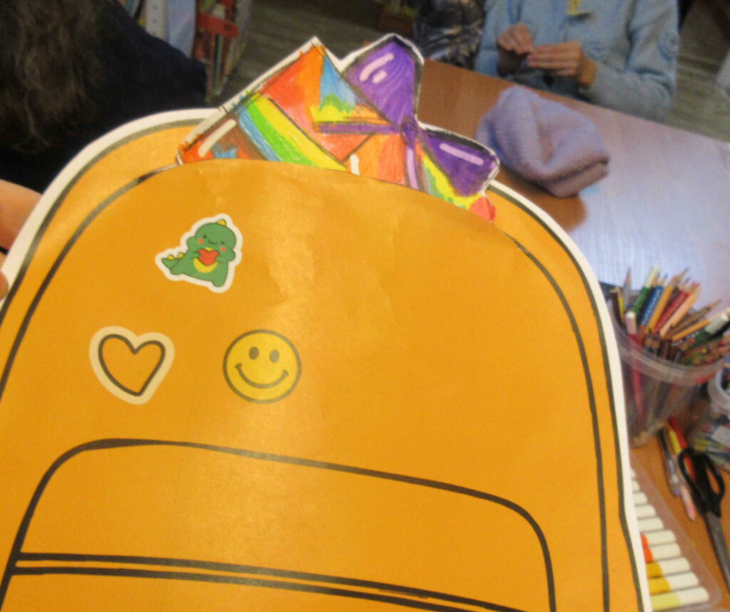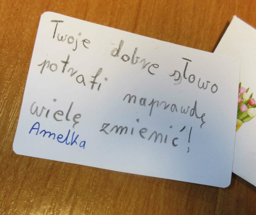W trakcie zajęć rozmawiałyśmy o życzliwości, o empatii, serdeczności i uprzejmości wobec innych, ale i wobec samych siebie. Do specjalnego plecaka zapakowałyśmy przedmioty symbolizujące życzliwość. Na zakończenie dziewczyny przygotowały liściki, z karteczkami pełnymi ciepłych i serdecznych słów.